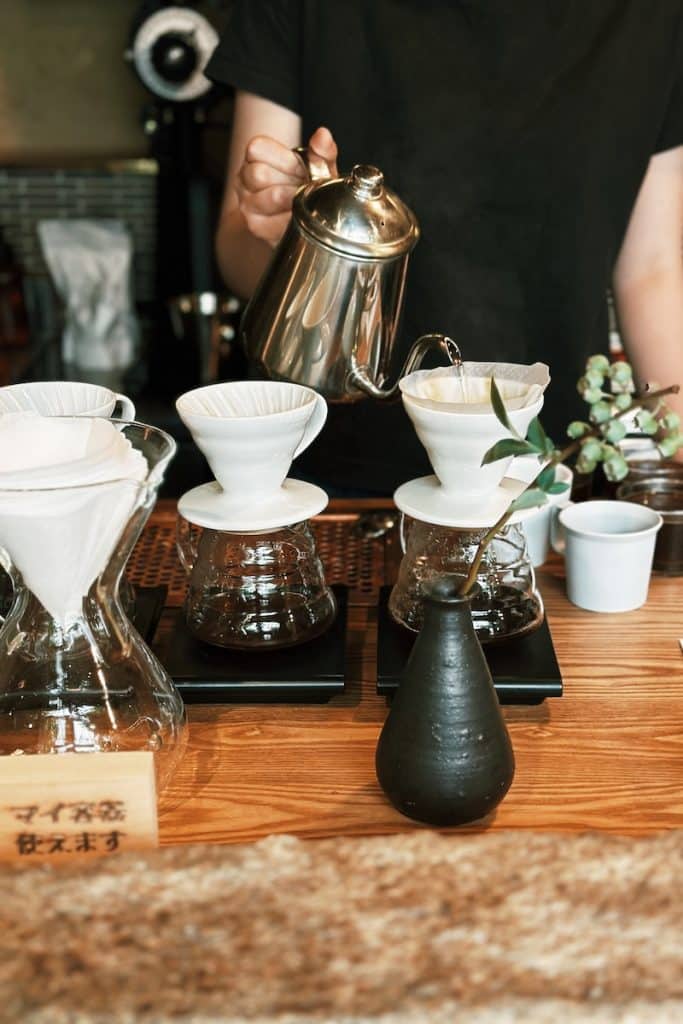 於是,翌日趁在 check-out 之前再去拜訪,可惜天公不造美,下雨拜訪顯得有點狼狽。因為停車場上沒有泊車阻擋,終於看到那家藏在不起眼角落、白色牆身的町家建築,早就有兩、三位人士在門前立飲。店內會擺放已裝入咖啡豆的小瓶,讓大家可了解咖啡的香氣後才購買。